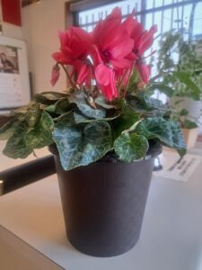 年末のご挨拶にご贔屓にしている「花のスエヒロ」さんから頂いたのは、赤いシクラメンです。